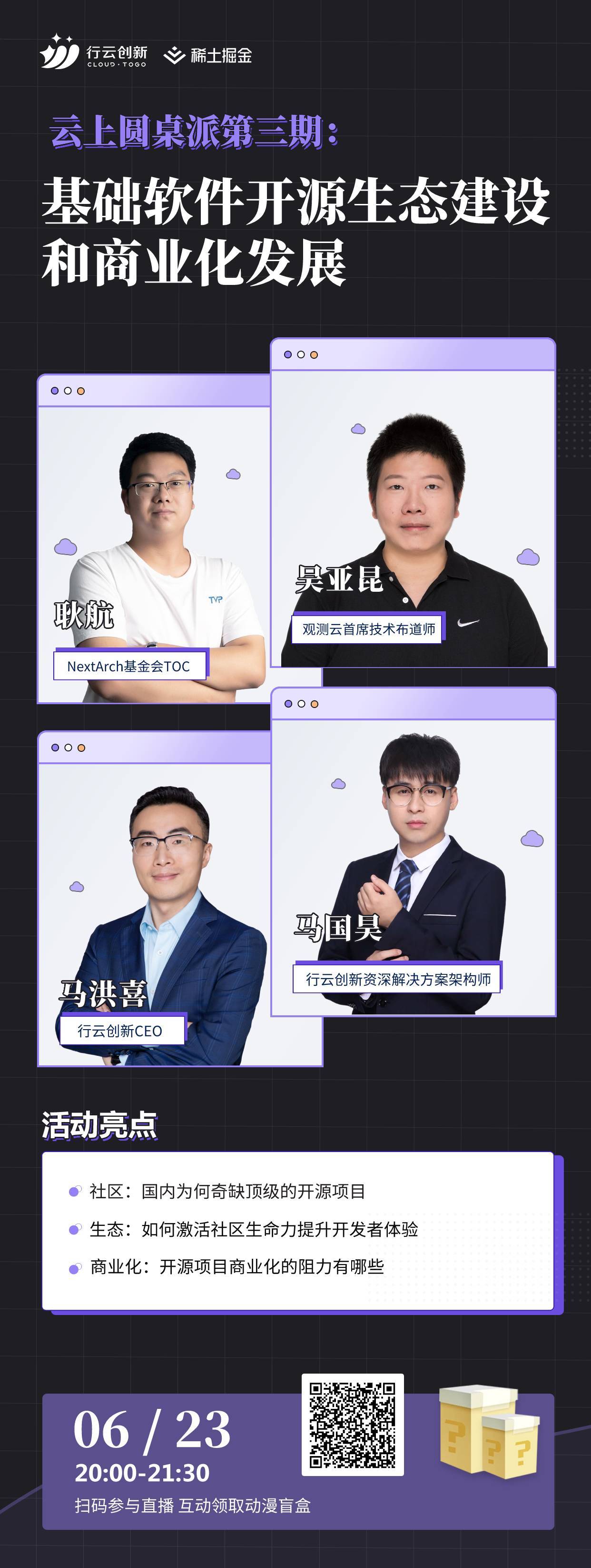 6月23日晚上20:00,云上圆桌派第三期《基础软件开源生态建设和商业化发展》即将开启,活动邀请NextArch基金会TOC耿航,观测云首席技术布道师吴亚昆,JIUYOU九游创新资深解决方案架构师马国昊三位大咖和JIUYOU九游创新CEO马洪喜一起对国内的开源生态现状、社区的建设及商业化发展等多个问题一起展开讨论。