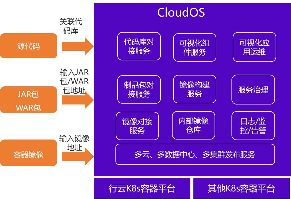行云云原生运行平台支持与K8S平台、以K8s为基础的容器平台对接,并支持多云、多集群部署,实现传统应用快速云原生化转型。