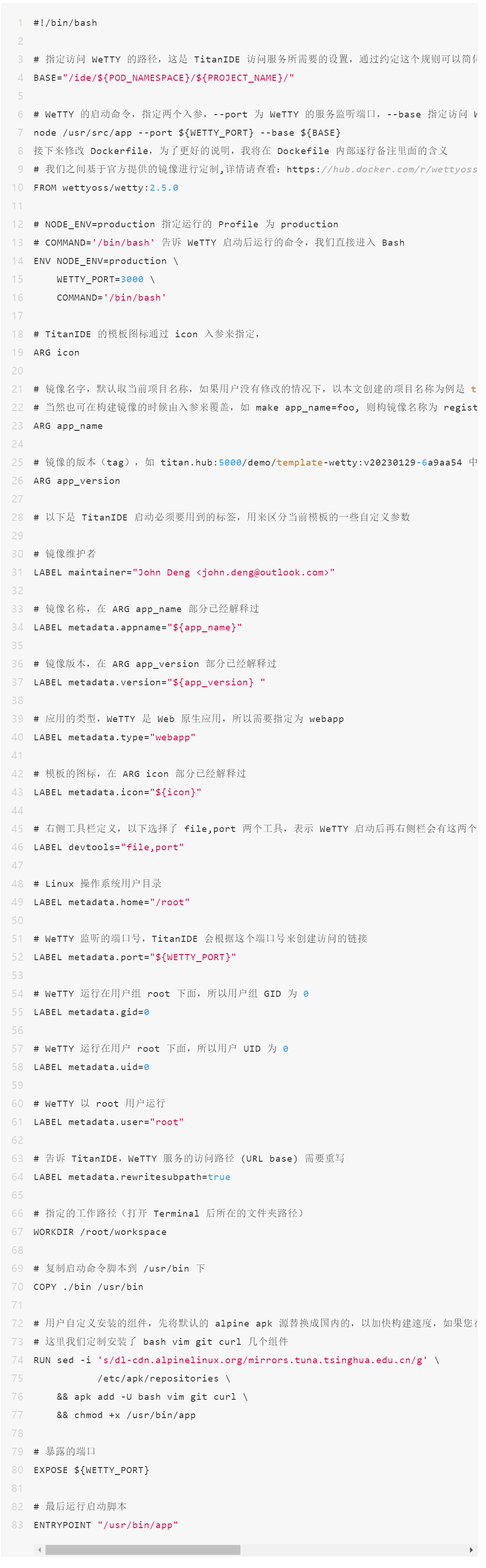在编辑 Dockerfile 之前,我们先准备一下 WeTTY 的启动脚本,并将保存为 ./bin/app。
