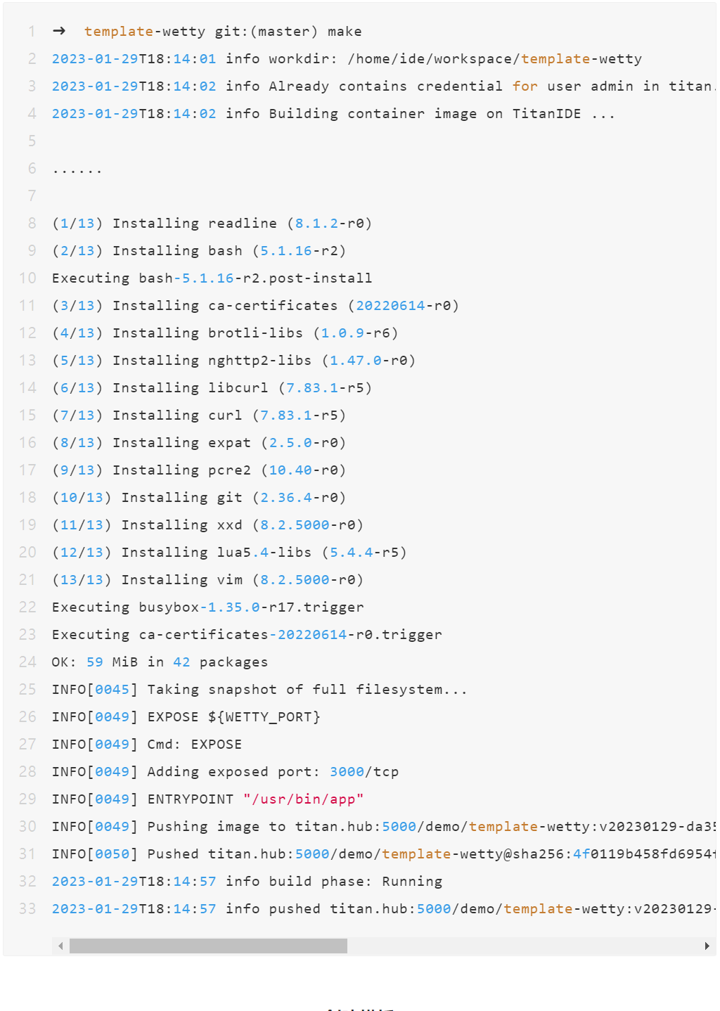 要在 TitanIDE 运行一个全新的 WeTTY, 首先需要构建一个模板镜像,然后通过模板镜像创建模板,再通过模板创建项目。当然以上是一次性操作,以后就可以直接通过创建好的模板创建项目即可。