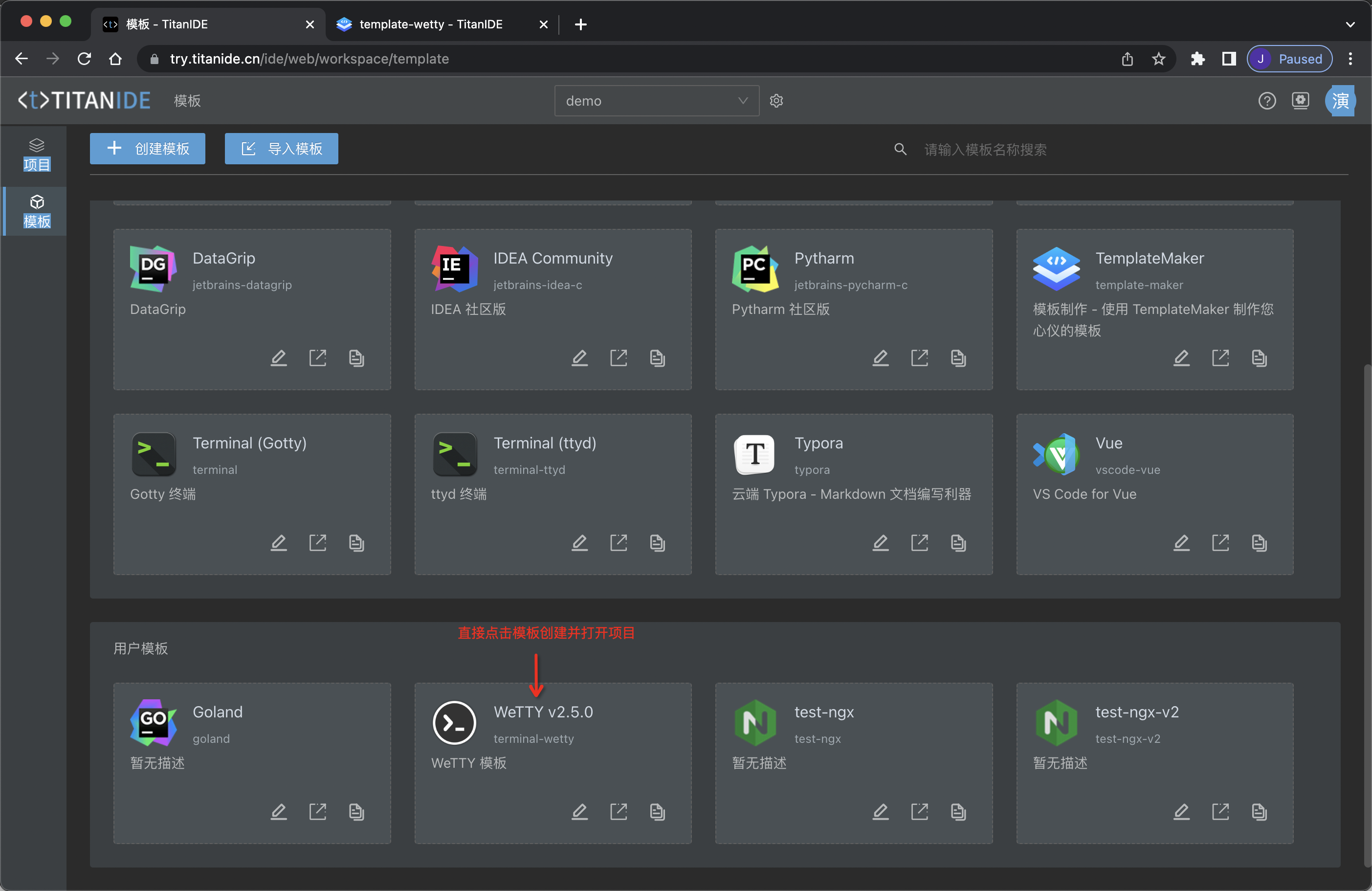在 TitanIDE 上构建模板镜像,需要通过 TemplateMaker 模板来创建一个项目 template-wetty。