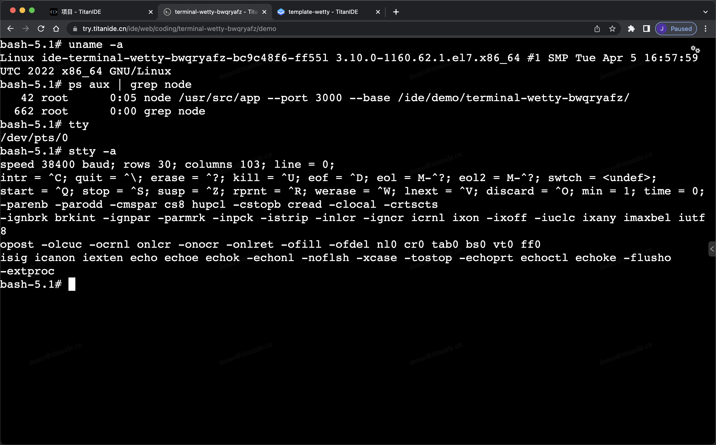 根据我们在上一篇文章《在 TitanIDE 玩转云原生 Terminal 系列(一):TTY 的前世今生》所了解到的,我们在 WeTTY 终端来验证一下 tty stty -a几个命令。