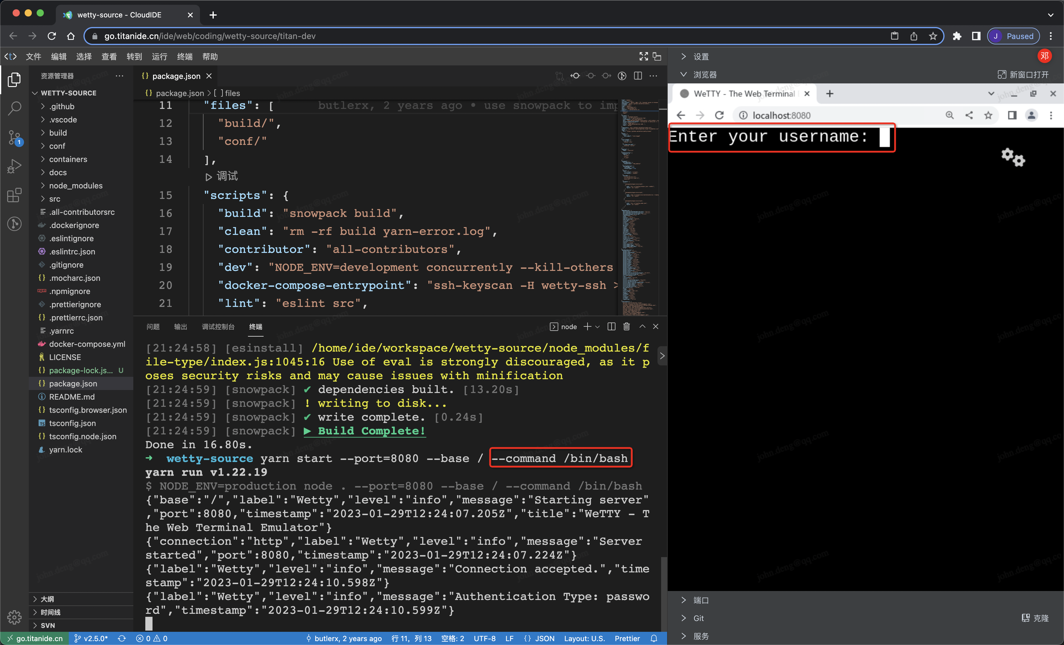 上图是我在 TitanIDE 创建了一个 VS Code 项目,克隆了 WeTTY 源码并运行起来了,指定了 --command 却不起作用,下面是完整的启动命令。